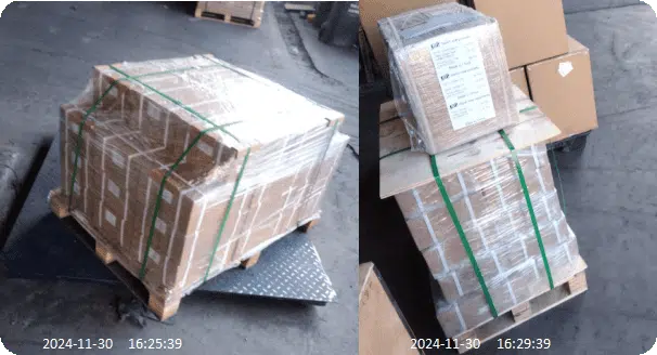 - Palettierung: Die Kartons wurden sicher auf zwei Paletten festgeschnallt, um Stabilität während der Handhabung zu gewährleisten.