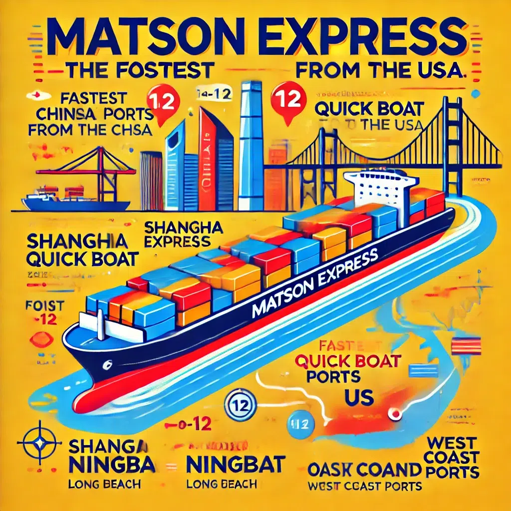 Για όσους αναζητούν την ταχύτερη επιλογή θαλάσσιων μεταφορών, Matson Express (Matson Quick Boat) είναι η καλύτερη επιλογή. Γνωστή για την αξιόπιστη και ταχεία εξυπηρέτηση της, η Matson προσφέρει μια γρήγορη λύση θαλάσσιων μεταφορών από την Κίνα στη Δυτική Ακτή των ΗΠΑ.