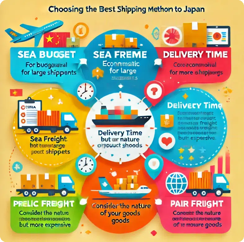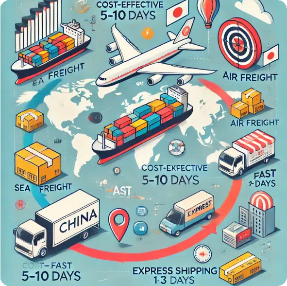 Oikean toimitustavan valitseminen on ratkaisevan tärkeää kustannusten, nopeuden ja tehokkuuden tasapainottamiseksi. Alla on tärkeimmät vaihtoehdot tavaroiden kuljettamiseen Kiinan ja Japanin välillä.