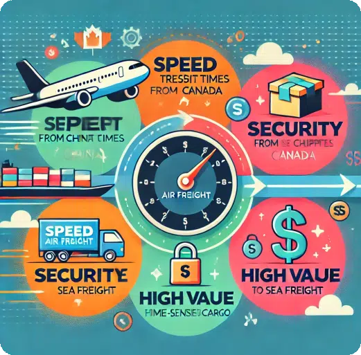 हवाई माल ढुलाई उच्च-मूल्य, समय-संवेदनशील शिपमेंट के लिए आदर्श है। यह समुद्री माल ढुलाई की तुलना में तेज़ है लेकिन काफी महंगा है।