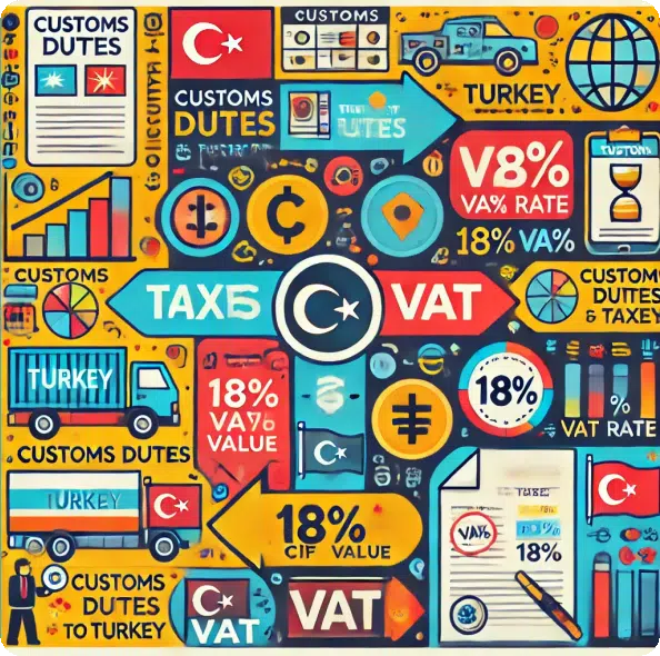 तुर्की लागू करता है मानक वैट दर 18% अधिकांश आयातित वस्तुओं पर वैट की गणना की जाती है कुल उतराई लागतजिसमें माल का मूल्य, सीमा शुल्क और शिपिंग लागत शामिल है।